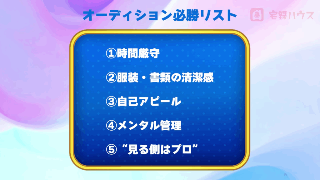宅録環境の強みを活かしながら、自分を“商品”として売り込む意識を持つことが、合格への近道になります。