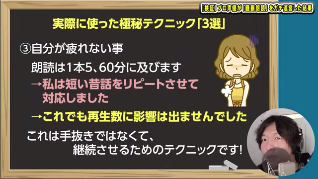③継続のための制作工夫(短い話×複数収録→リピート活用)1時間朗読を録るのは負担が大きい。短編を6〜7本収録し、組み合わせて長尺化。睡眠朗読の始め方で最重要なのは「継続」すること。長尺を無理に作るより効率的。作業疲れを軽減し、品質を安定させる技術。編集負担を減らし、長期的に活動しやすくする工夫。