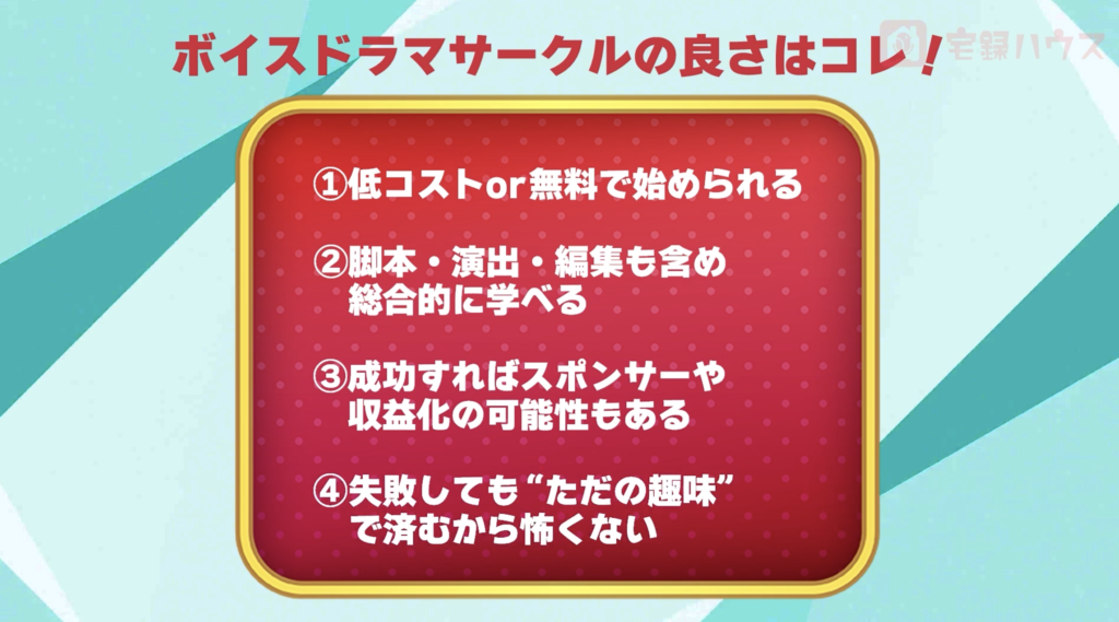 お金もほとんどかからず、宅録レベルからでも始められて、演技力・企画力・編集力まで鍛えられる。