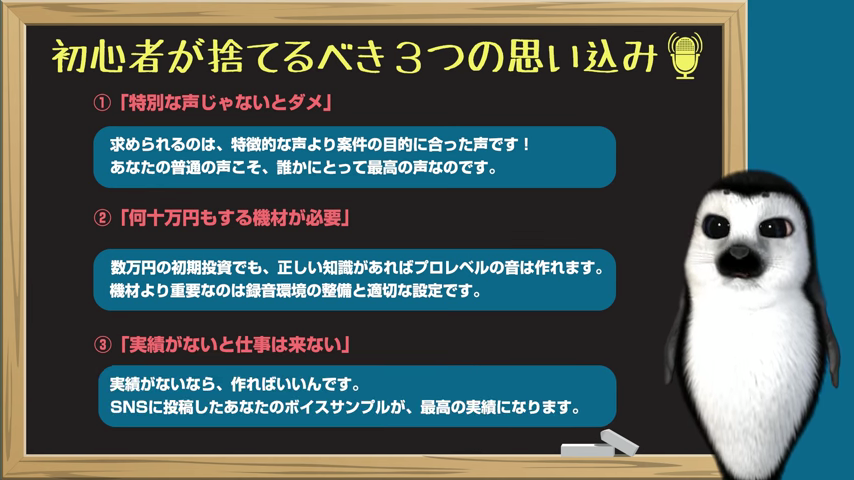 | ③ 実績は自作できる | SNS投稿が営業資料になる | 実績ゼロでも、SNSやYouTubeにボイスサンプルを投稿すれば立派なポートフォリオ。公開した音声が直接、案件獲得の呼び水になる。 |