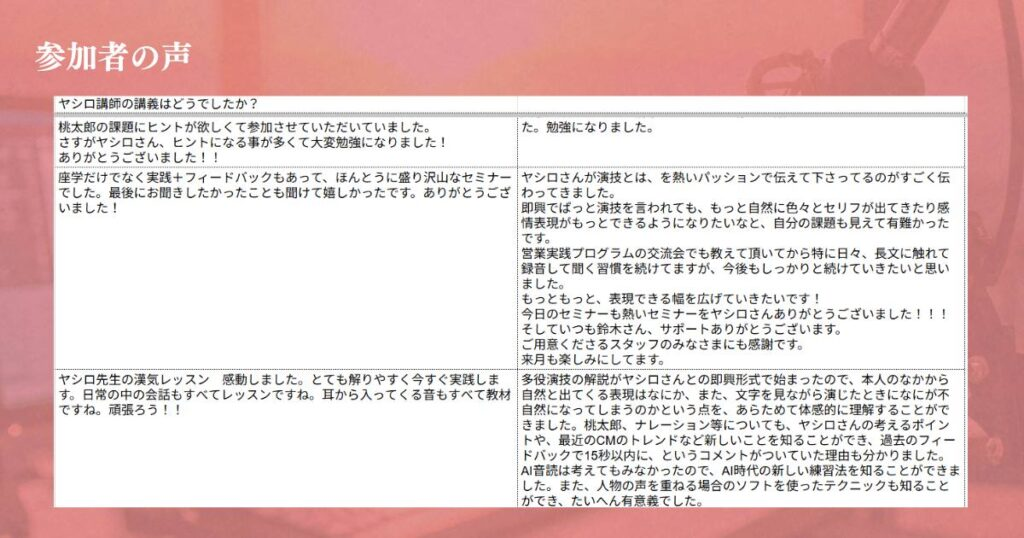 畑耕平さんや現役声優のヤシロこーいちさんなどが直接登壇し、参加者の質問にも丁寧に答えてくれるため、「学んだことをすぐ実践に活かせる」と多くの声が寄せられています。