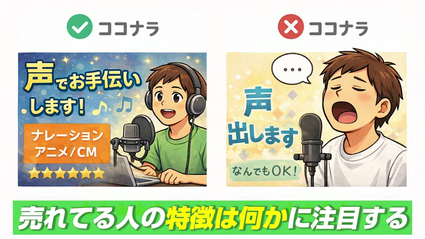 大事なのは、正しい順番で準備し、声を売る仕組みを理解し、出品と改善を繰り返すことです。
